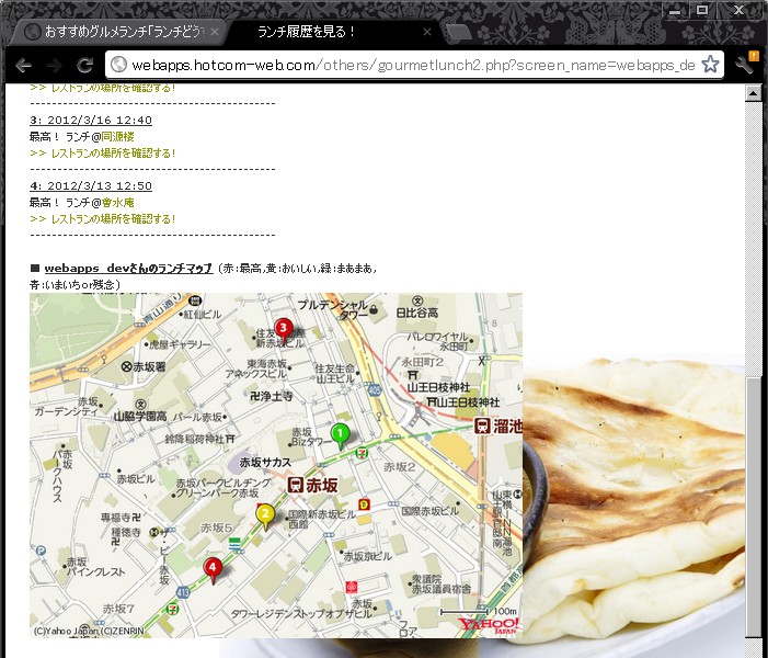 Bつぶやき機能でつぶやいた、レストランの一覧がみられます。 「レストラン名」をクリックすると該当レストランに関するグルメサイトが、 「レストランの場所を確認する」をクリックすると地図が起動します。